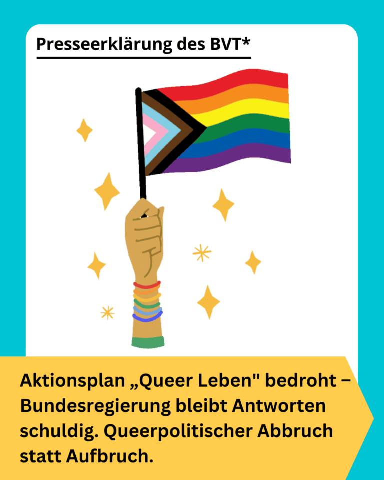 Queerpolitischer Abbruch statt Aufbruch Der Bundesverband Trans* sieht den Aktionsplan „Queer Leben“ bedroht – und damit die demokratische und vielfältige Zivilgesellschaft. In der Antwort auf eine Kleine Anfrage des Abgeordneten Maik Brückner (MdB,...