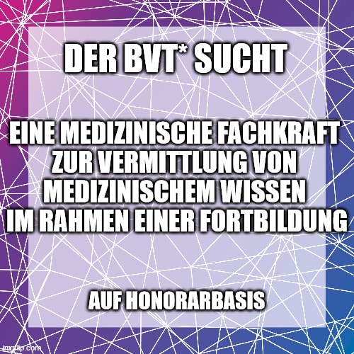 BVT Grafik in lila. Darauf steht in weißer Schrift: Der BVT sucht eine medizinische Fachkraft zur Vermittlung von medizinischem Wissen im Rahmen einer Fortbildung auf Honorarbasis.
