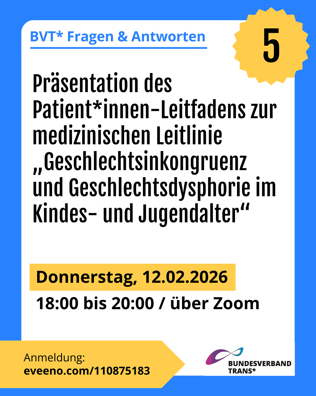 Der Bundesverband Trans* wurde 2015 mit dem Auftrag gegründet, die in der Waldschlösschen-Erklärung festgehaltenen Forderungen umzusetzen. Seitdem haben wir mit Blick auf rechtliche, politische und medizinische Fortschritte diese Forderungen weiterentwickelt: